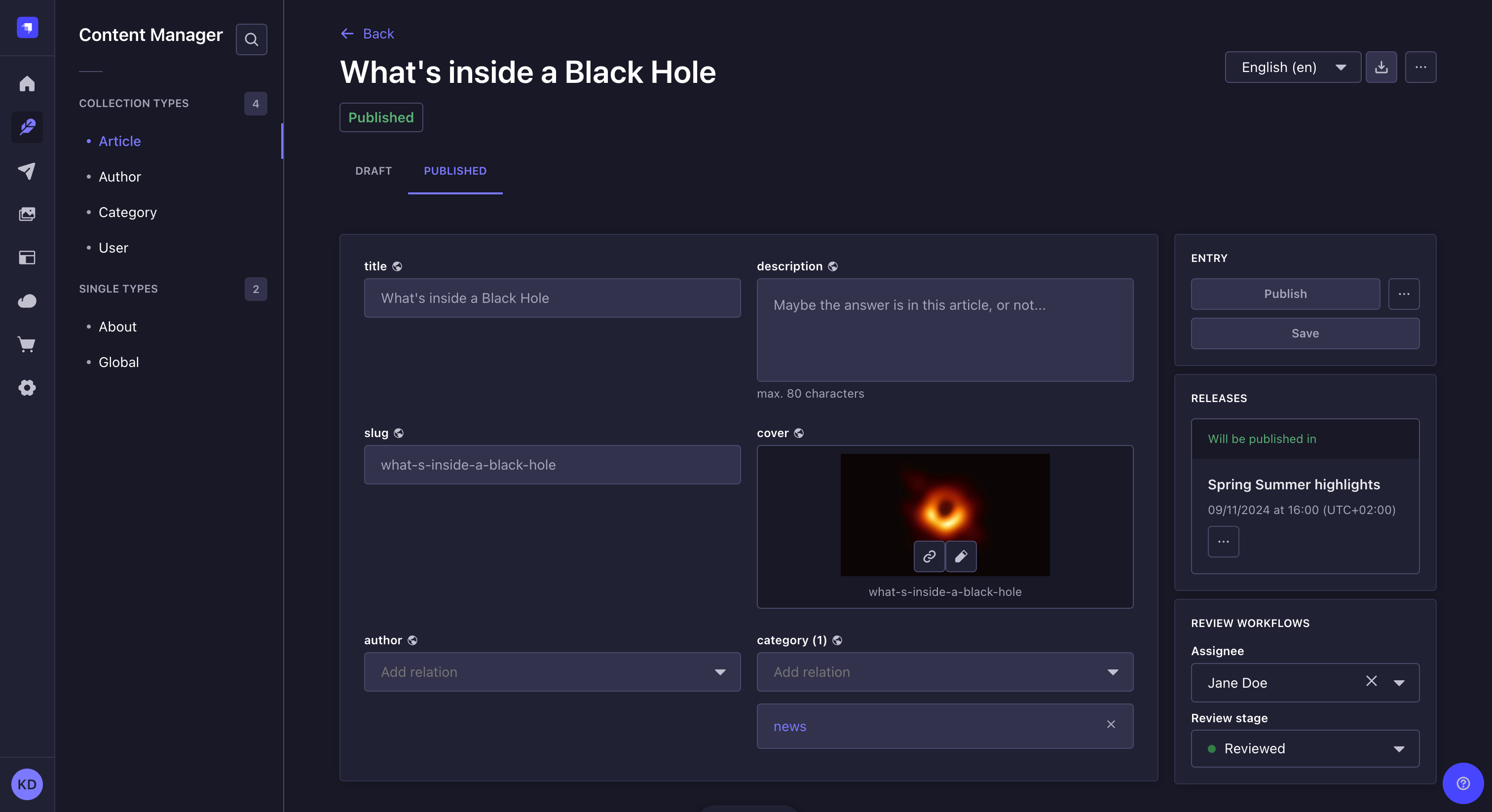 With Draft & Publish enabled, the Content Manager's edit view indicates the current status of your content type's entry at the top of the interface. Your content can have 3 statuses: