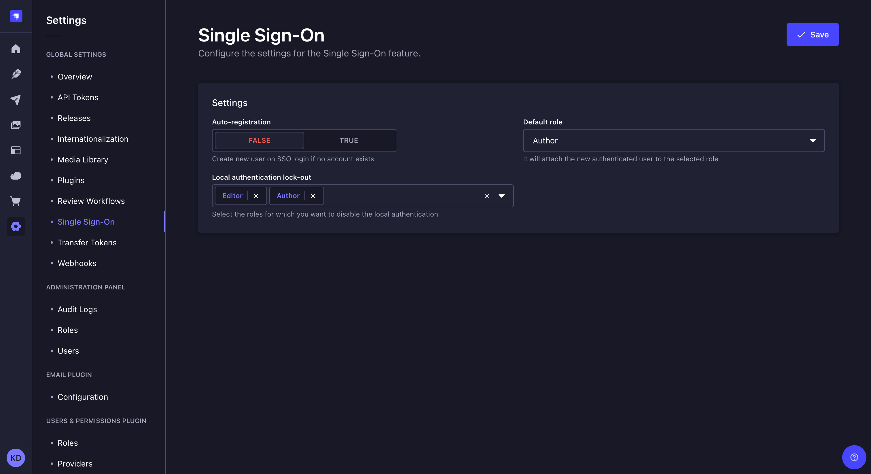 | Auto-registration | Click on True to allow the automatic creation of a new Strapi administrator when an SSO login does not match an existing Strapi administrator account. If this setting is set on False, new Strapi administrators accounts must be created manually beforehand. |